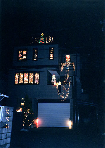 この家を建てて、ハウスメーカーからの引渡し日が、ちょうどクリスマスイブの12月24日だったので、それを、記念してクリスマスイルミネーションを、始めました。今年で、3年目なのですが年々派手になり、去年までは、1階と2階だけだったのが、今年は3階屋上まで飾り付けてしまいました。でも、大変楽しく主人と、あれこれ考えながらやっています。