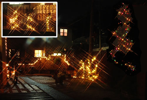 今年は玄関前の壁やモニュメントにも電飾をしてみました。シンボルツリーにはミックスカラーでおめかし♪