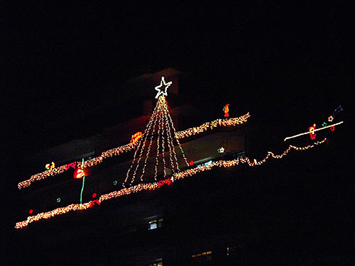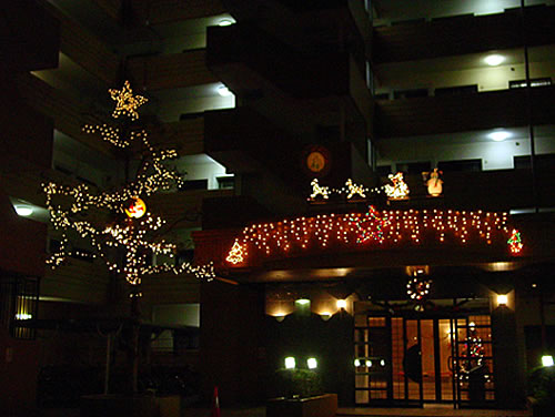 マンションの6階〜8階のベランダを利用して大きなツリーを飾りました。星は手作りです★エントランスも皆で楽しく飾りましたが、シンボルツリーの枝ぶりが少々寂しくて残念です。クリスマスの後はお正月バージョンに変身です。