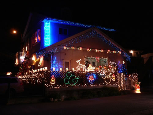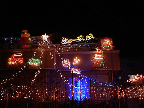 サンタプレゼントおもちゃが沢山詰まった家をイメージしながら飾り付けをしました。飾りつけ5年目になりハート ミッキー ミニー ツリー作って玄関に飾り、高い部分や一人で無理な場所は、家族に手伝ってもらい2ヶ月前から毎日こつこつ一人で飾ってやっと完成しました。毎年お年寄りや子供さんが楽しみにしてくださってるので励みになってます。