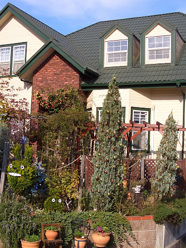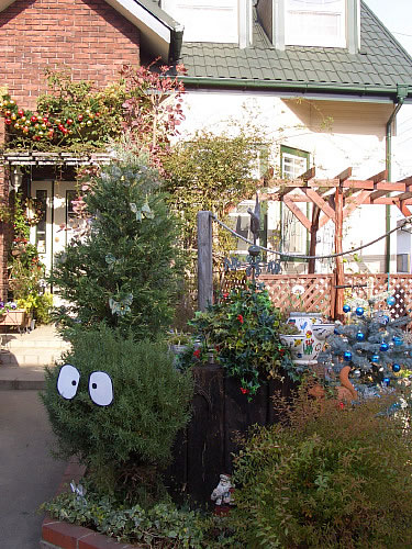 クリスマスの飾りに誘われて、トトロ達が遊びに来てくれました。道行く子供達の歓声や笑い声は、きっとサンタさんに届くはず。小さいけれど、庭のメインツリー「ホプシー」。シルバーリーフに青いボール。おひさまに照らされて、キラキラと輝いて日中ののイルミネーションです。