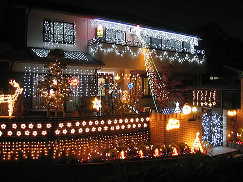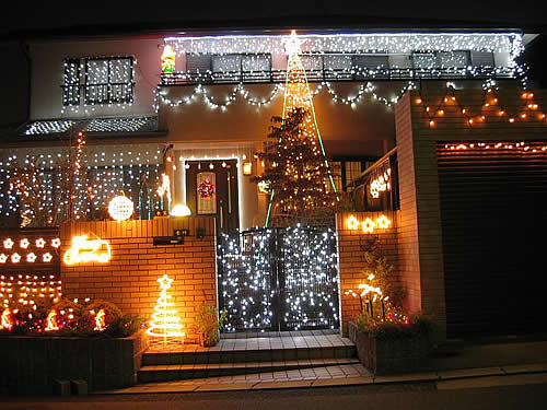 今年のテーマは「星」です。本格的に飾り始めて3年目です。女性一人で飾っていますので、色々限界がありますが、がんばっています。昼間見てもきれいな飾り付けを目指しています。