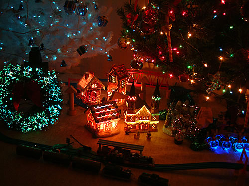 メインツリーは3年目のアルバータツリーです。(本当にこれでよかった!)今年はハンダ付けを沢山して、匂いで気持ち悪くなりました。ツリーの下に小さな町を作りました。