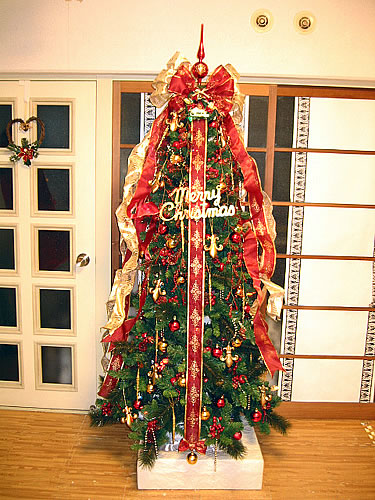 御社で購入したキングピークスリムの185センチです。キッチン横に設置しましたが、ゴージャスなのに場所をとらなくて、でも重厚で葉もいろいろ種類があって本物みたいですごく気に入っています。葉が一本一本丈夫で子供の襲撃にも強いのがまたいいですね。赤と金で飾り付けました。友達同士でちがうリボンを買って交換して3種類のリボンで飾り付けていますが上品にできたと好評です。いままで、ここにあったツリーは、150センチくらいしかなかったので存在感があって、大きなツリーっていいなあーとため息をつきながら子供と楽しんでいます。 |