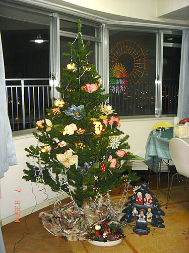 今年で13年目のツリーです。毎年少しづづバージョンを変えながら飾りつけるのがとっても楽しいです。窓の外のイルミネーション(観覧車のクリスマスバージョン)も素敵ですよ。