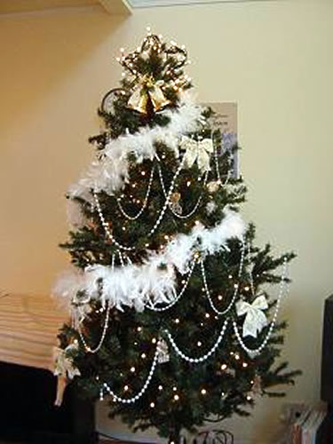 毎年、メインカラーを決めて飾ります。今年は天使をイメージして『白』で飾りました。羽ガーラントとビーズガーラント、アクリルオーナメントの他ツリートップには 針金を星型にしてライトを巻き付けました。