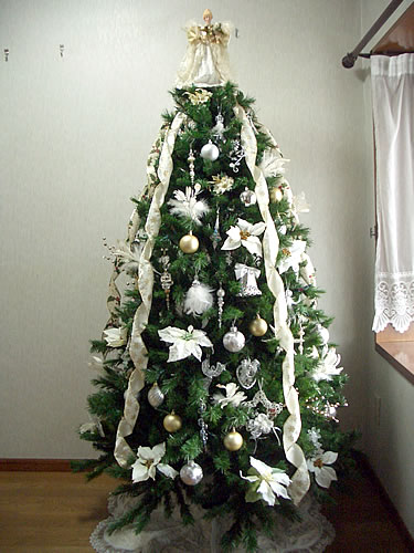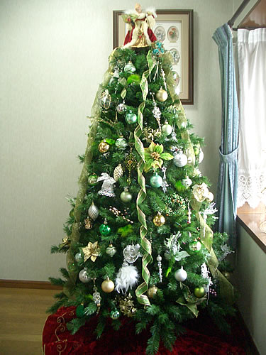 中城さんのツリースカートに一目ぼれして今年のテーマカラーを白にしました。ツリーはカナダで購入したもので、トップにはカナダ風に天使がのっています。もう1本は去年のものでグリーンをテーマカラーにしたものです。