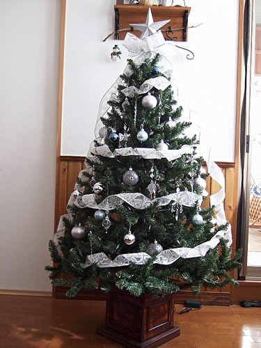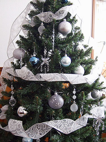 昨年こちらで購入したウッディープランターツリー155cmです。今年はシルバー&クリスタル系に少しだけブルーも加えました。毎年色を変えて楽しんでいます。緑の葉の色が濃いので、インテリアにもよくなじみとってもおちついた雰囲気のツリーです。御社で購入したクリスタルのオーナメントがライトをつけるとキラキラと光ります。画像は朝撮りましたのでライトはつけておりません。クリスタルが多いので、地味に見えますが、アップ画像を見ていただいたらわかるようにとても綺麗です。毎年こちらのHPに載せていただいているので大変よい記念になります!ありがとうございます♪ (写真2枚) |