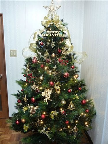 昨年は大人のクリスマスツリーでしたので、今年はゴールドを基調に残したまま赤のオーナメントだけ購入し、かわいらしいツリーにしてみました。トップのスターにもライトが点くのでとても華やかです。 (180cmキングピークツリー)