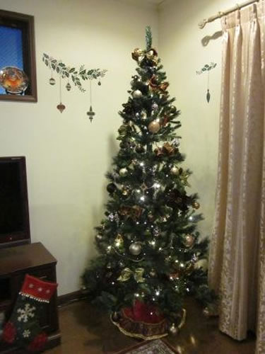昨年購入させていただいたキングピークスレンダー215cmはとても気に入り、今年も飾るのが楽しみでした。 今回は電飾を75球⇒150球へ増やし、背面にウォールステッカーを貼り、雰囲気アップを図りました。 是非ウォールステッカーも取り扱っていただきたいです。 知人の新居祝いにも紹介させていただきました。