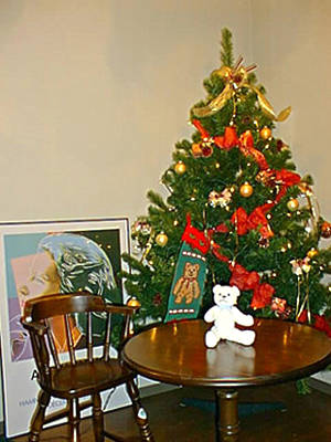 小さくて見えないのが残念ですが、 公園で拾ってきた松ぼっくりをもとに作った オーナメントは最高の自信作です。 家にあった素材を使って、ツリーの木以外は ほとんど手作りです。 (ベビーカーを押しながら、娘の生まれた年に 拾った松ぼっくりもいい思い出の一つです。)