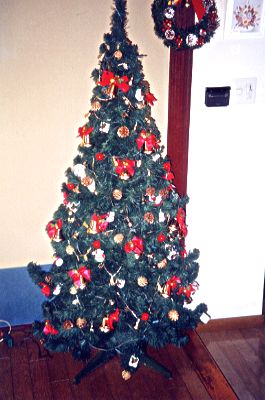 このツリーは10年ぐらい前に購入しました。 とっても高かったんですが、思い切って 購入して大正解!心棒がほとんど見えず、 今でも葉が生き生きしています。 オーナメントは後ろのリースと雰囲気を 合わせています。