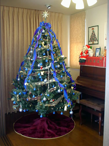 オーナメント、スカート、リボンはドイツ、アメリカ、カナダで買ってきた思い出の品々です。ブルーのリボンでかなり豪華になりました。